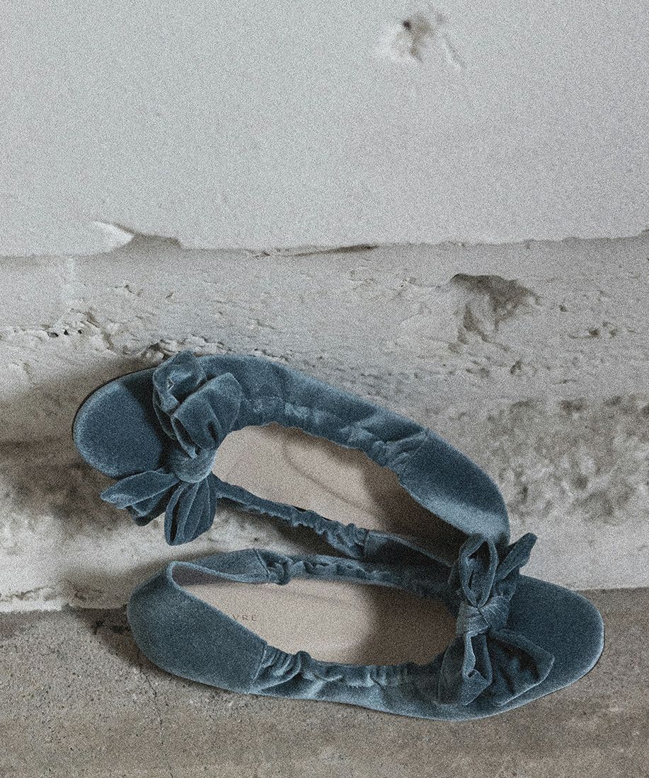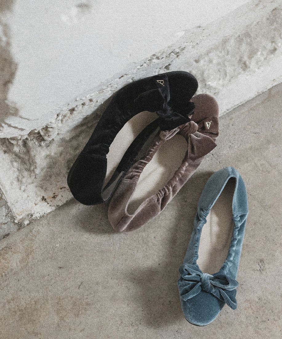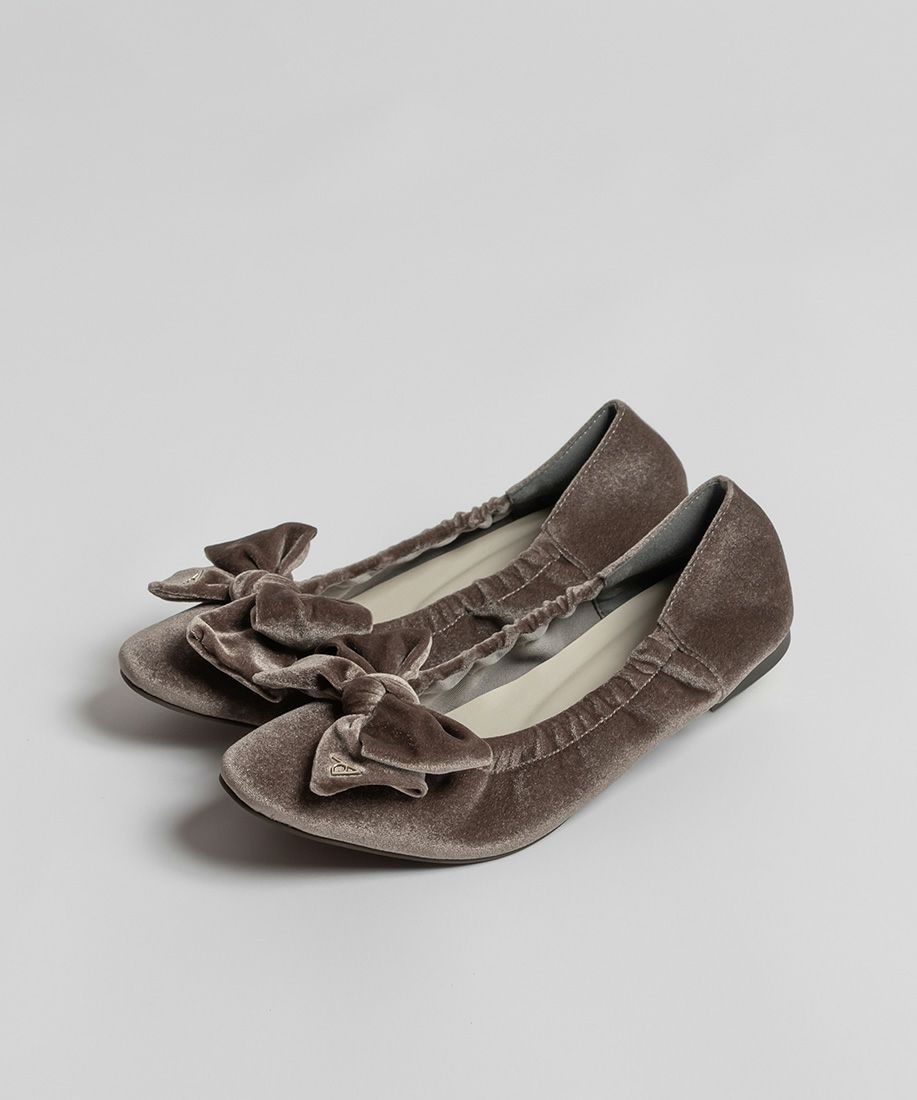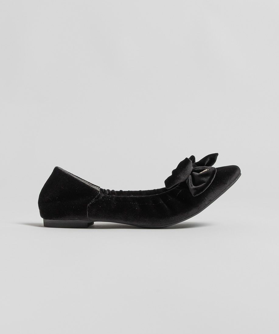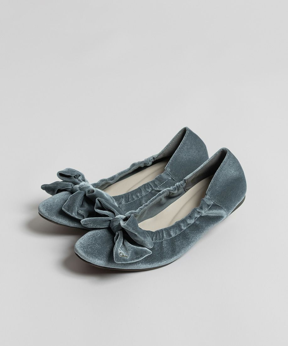 大きなリボンモチーフが目をひく、ソフトベロア素材を使用したフラットパンプスです。