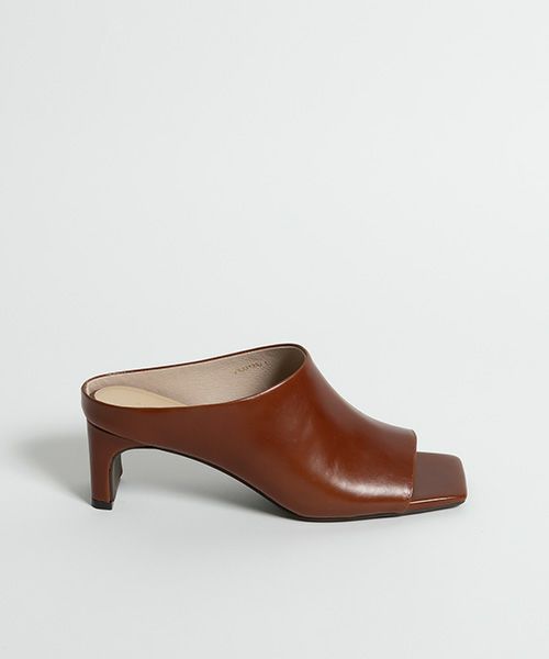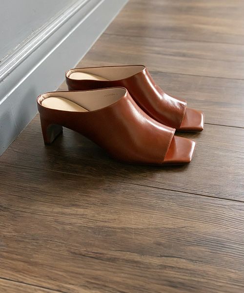 エッジの効いたスクエアトゥがモードな印象のレザーミュールサンダル。