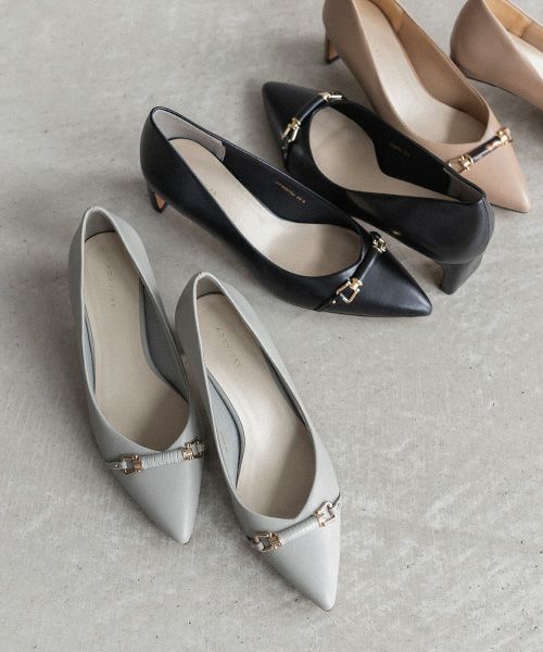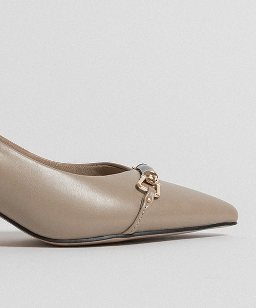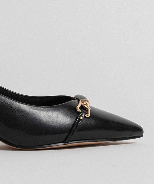 すっきりとしたポインテッドトゥに華奢なナロービットを合わせたパンプスです。