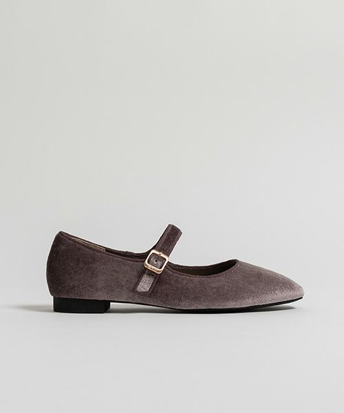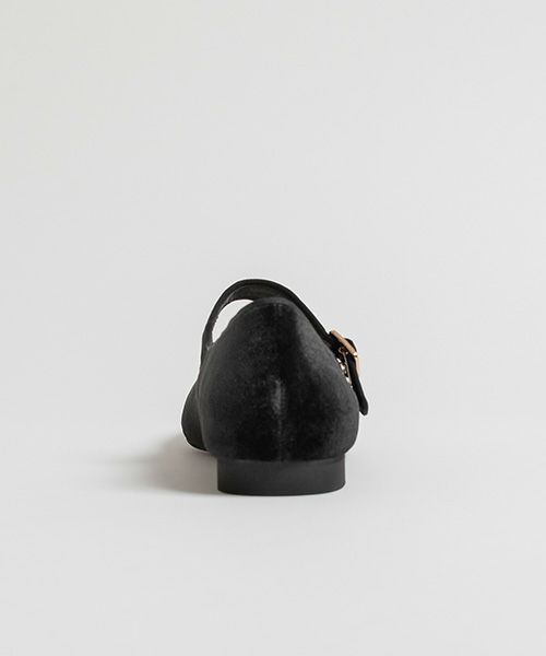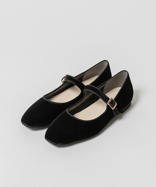 トゥ先が薄いソフトスクエアトゥで甘すぎないシルエットのメリージェーンタイプのフラットパンプス。