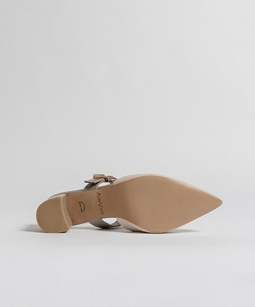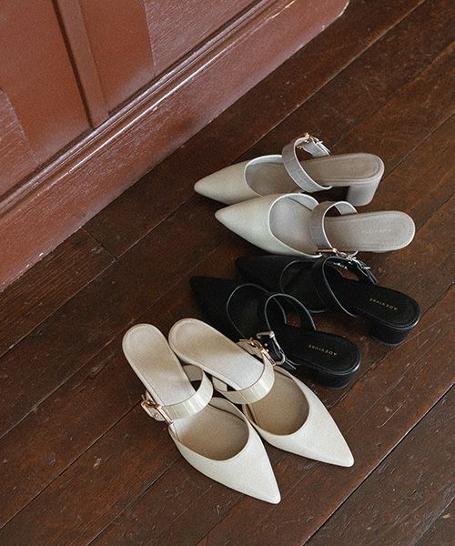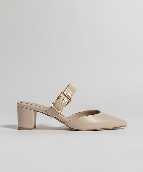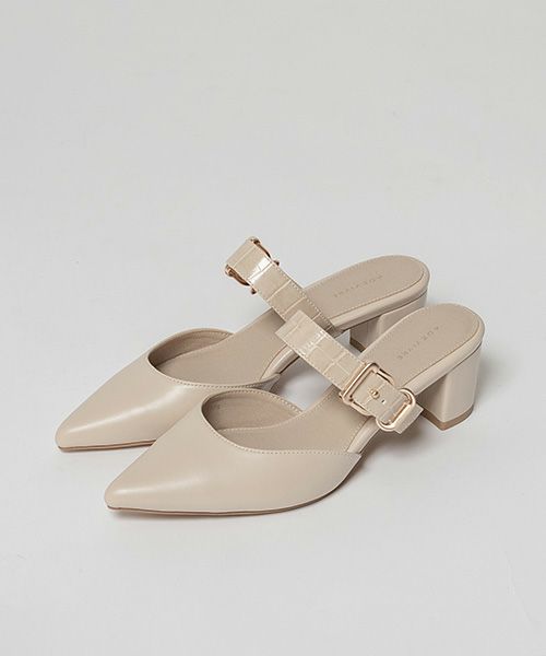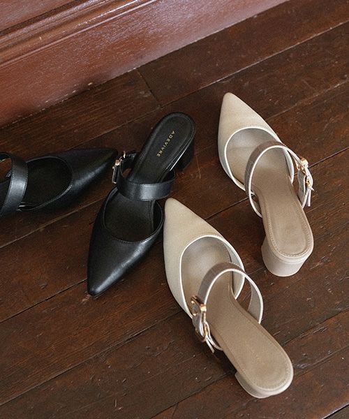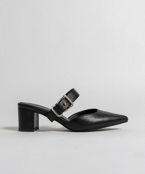 シャープなポインテッドトゥとワンベルトがポイントのミュールパンプス。
