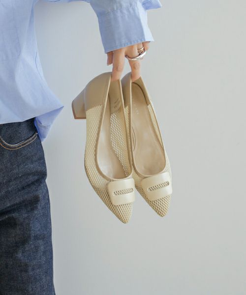 チュールとメッシュ生地を重ねた程よい透け感のあるポインテッドパンプスです。