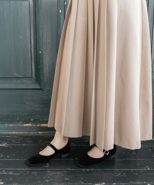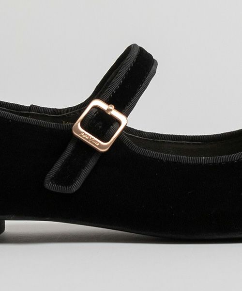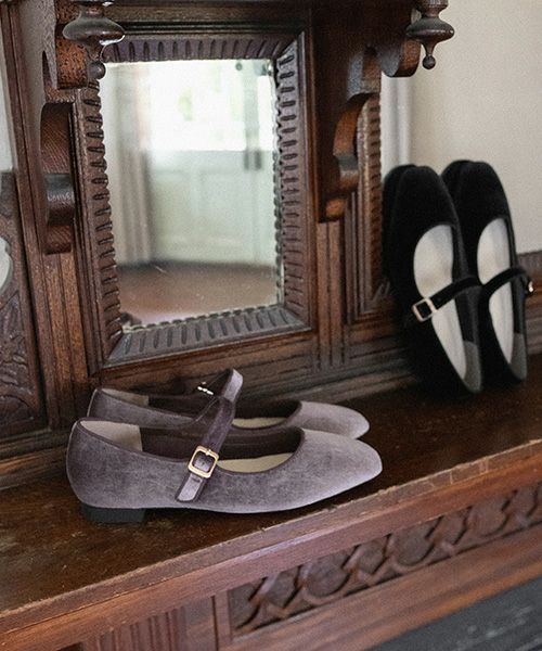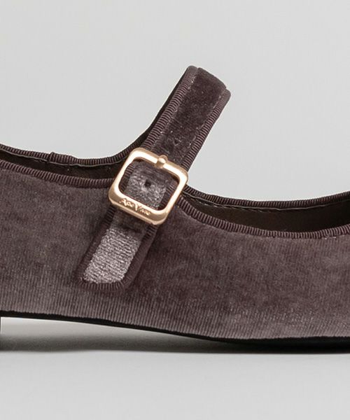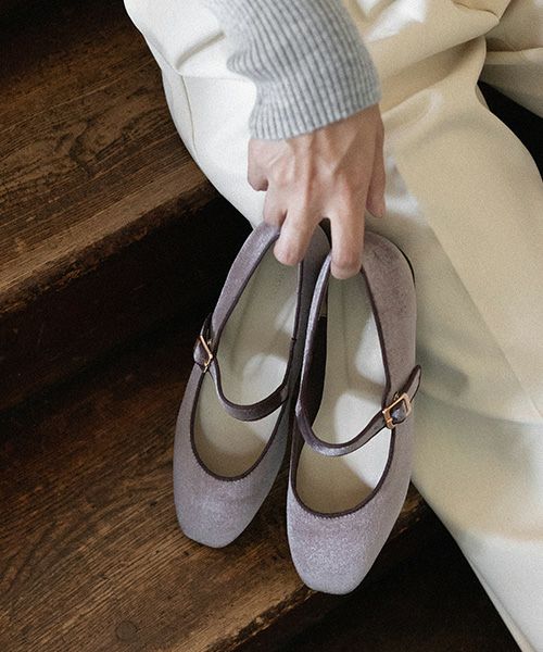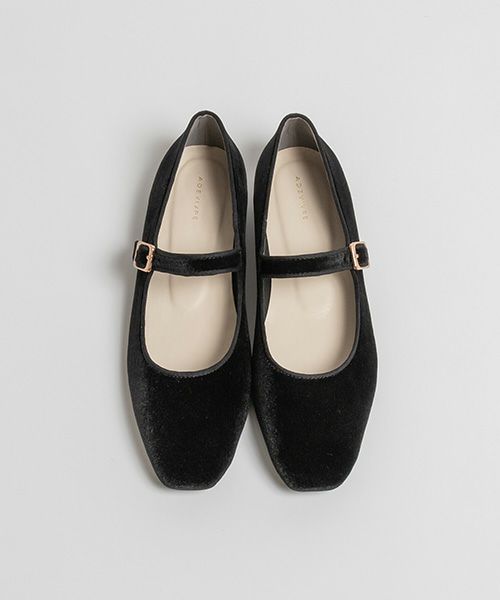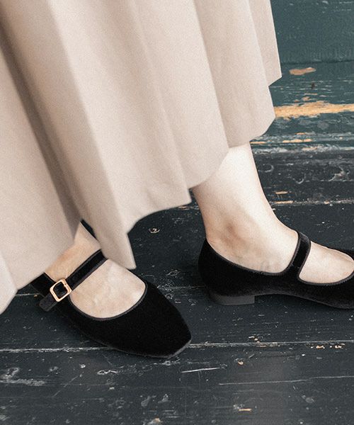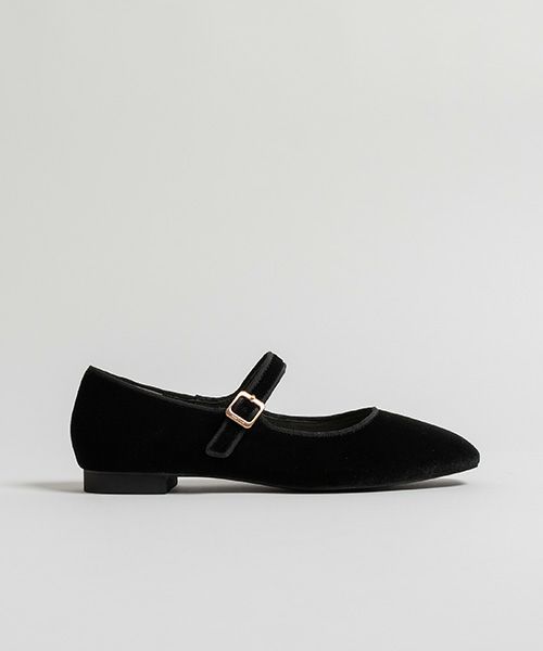 トゥ先が薄いソフトスクエアトゥで甘すぎないシルエットのメリージェーンタイプのフラットパンプス。