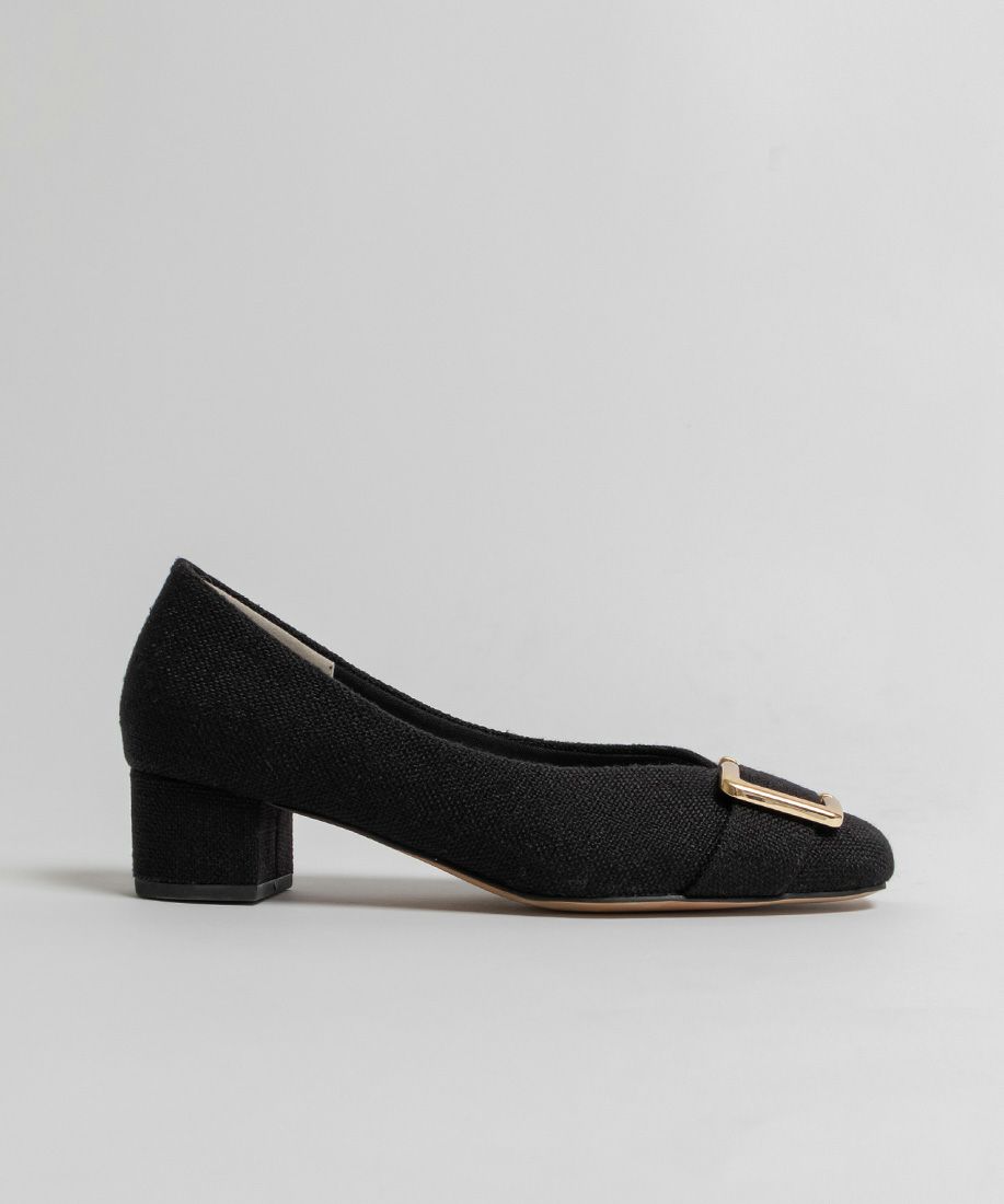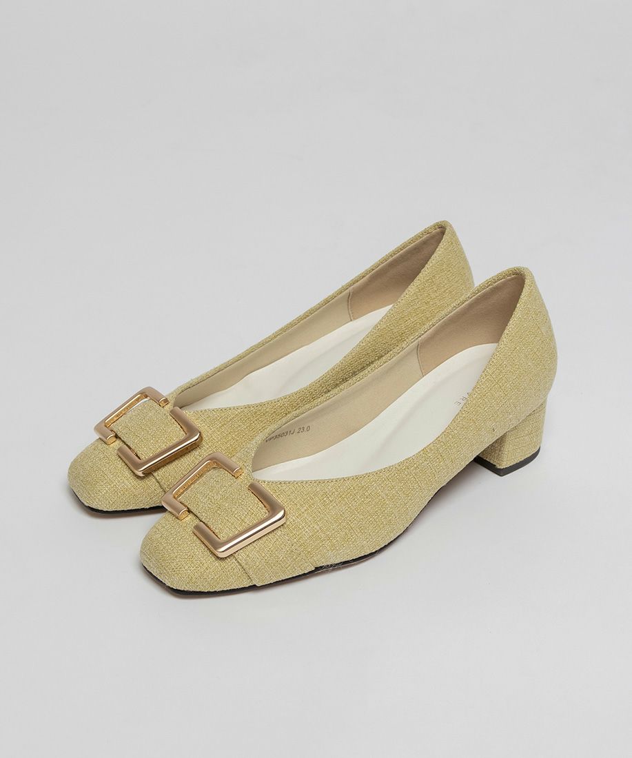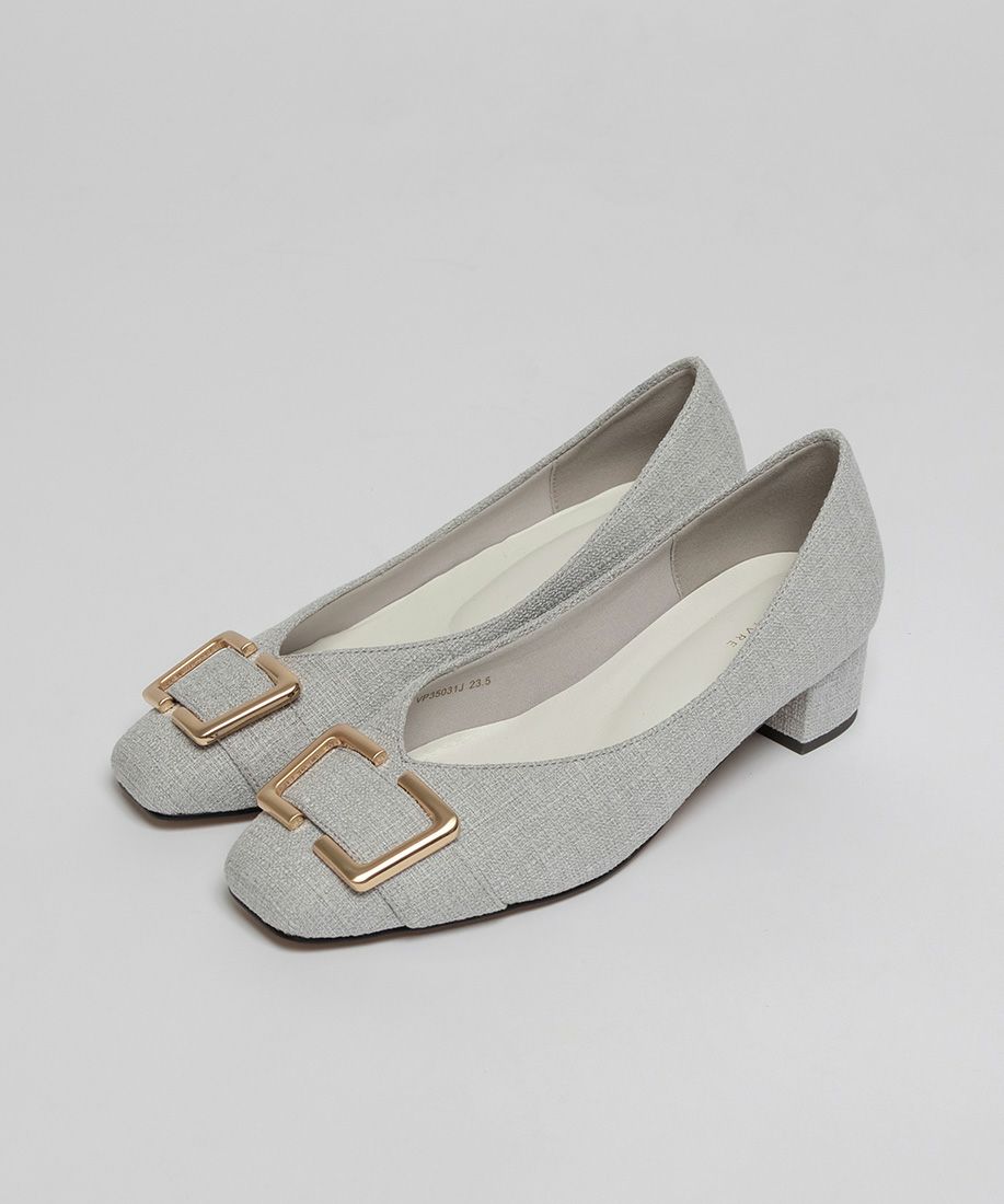 スクエアモチーフの飾りがポイントのスクエアトゥパンプス。