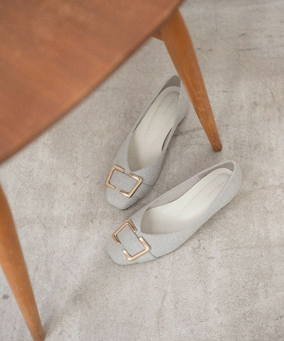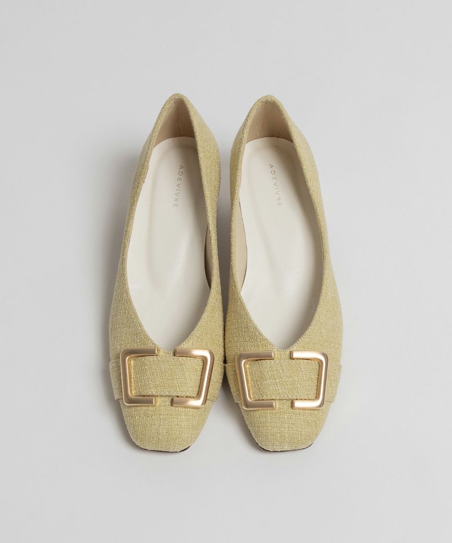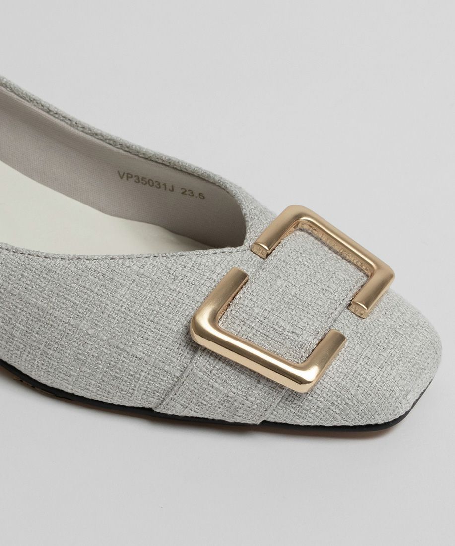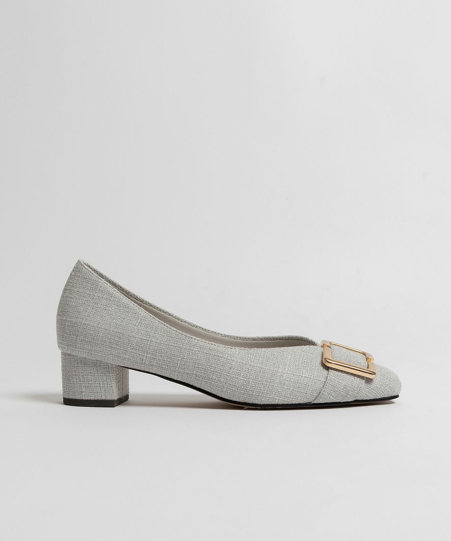 スクエアモチーフの飾りがポイントのスクエアトゥパンプス。