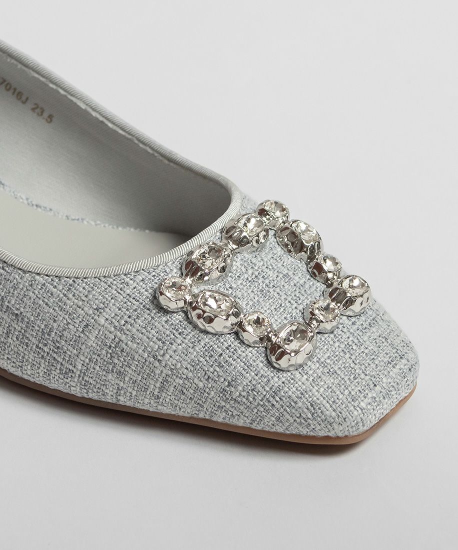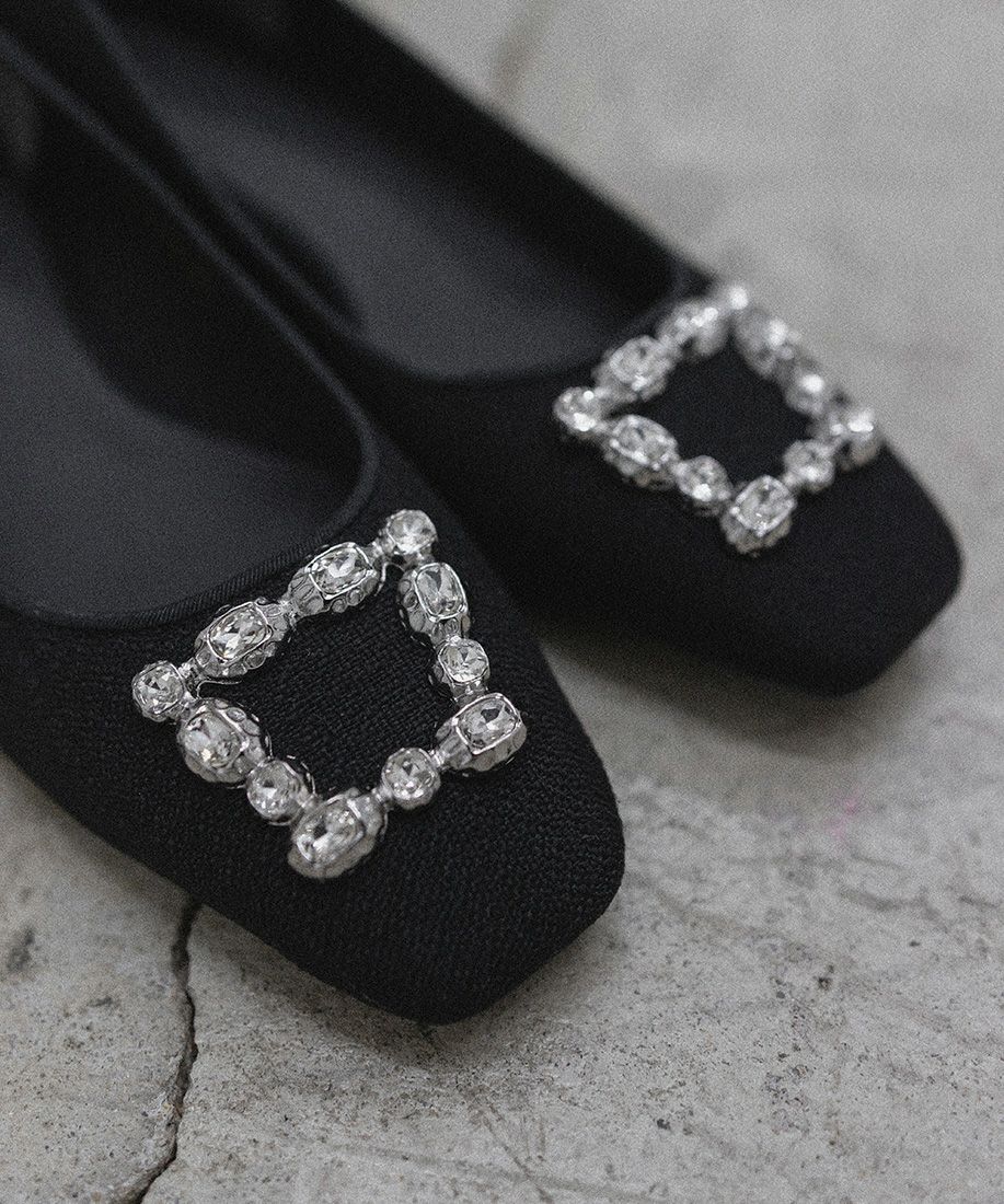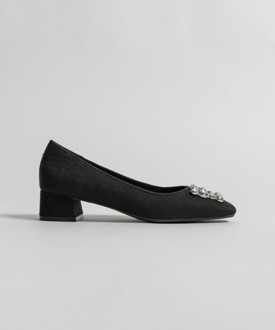 すっきりとしたスクエアトゥに、ビジューパーツがポイントのパンプス。