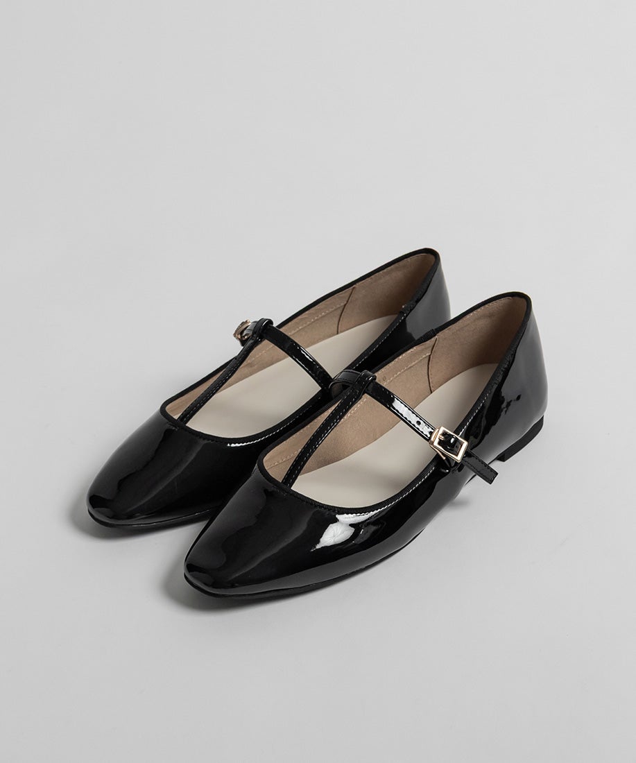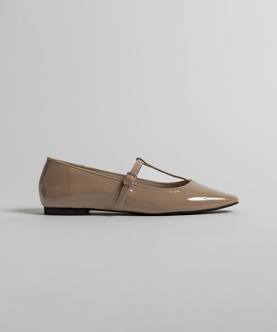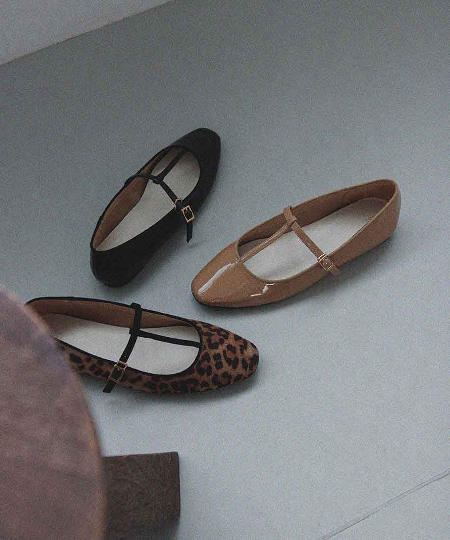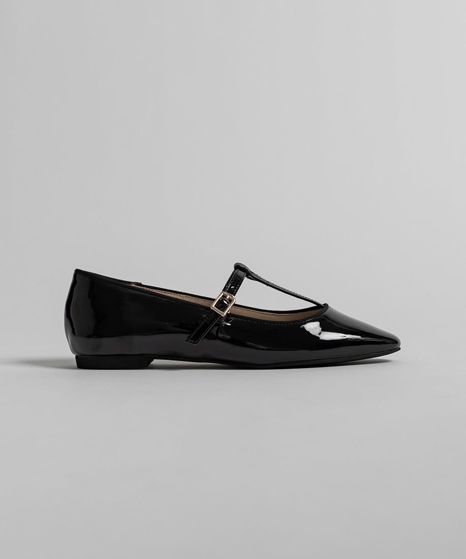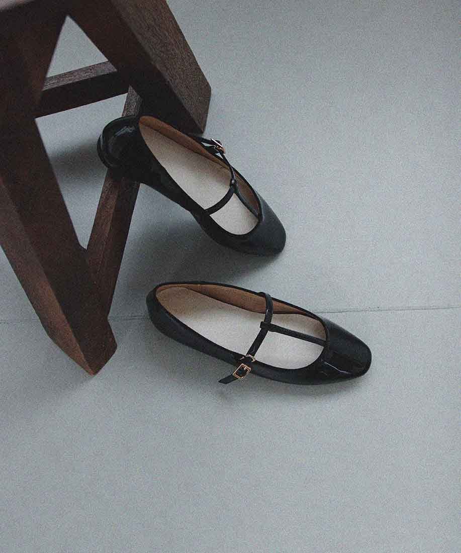 バレエシューズのような軽快な履き心地に、Tストラップでクラシックな印象を加えた一足。