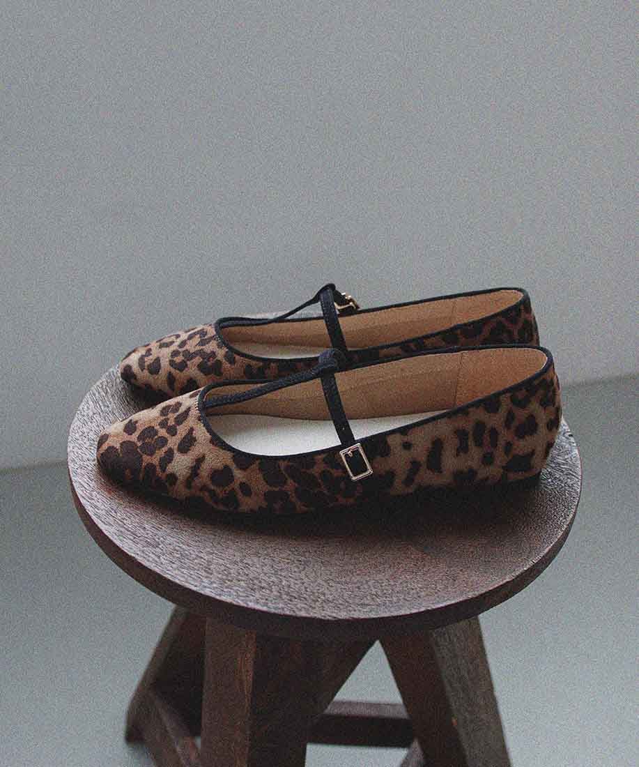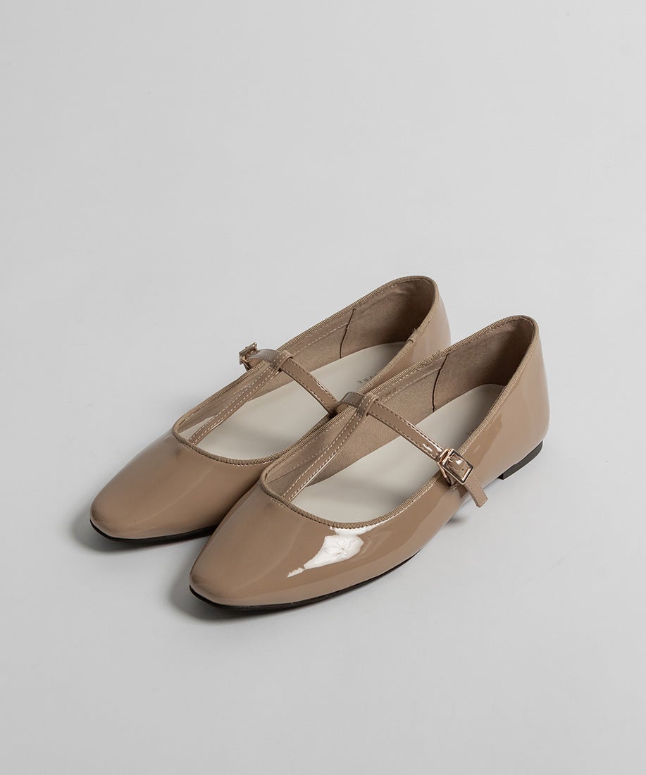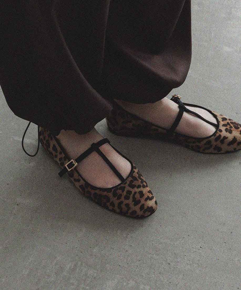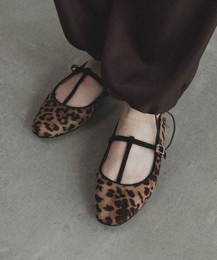バレエシューズのような軽快な履き心地に、Tストラップでクラシックな印象を加えた一足。
