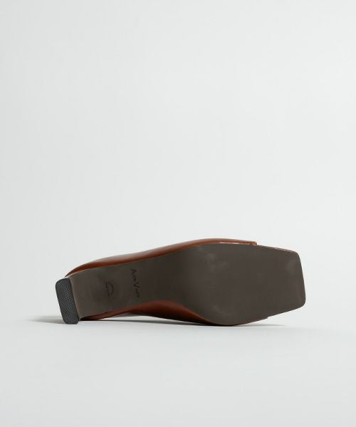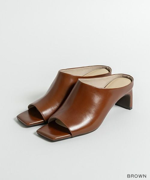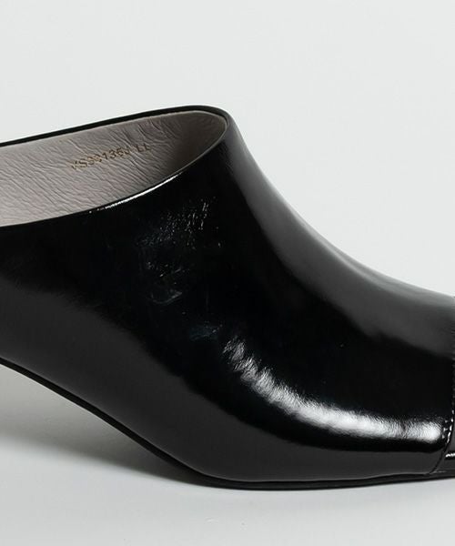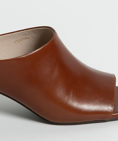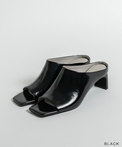 エッジの効いたスクエアトゥがモードな印象のレザーミュールサンダル。