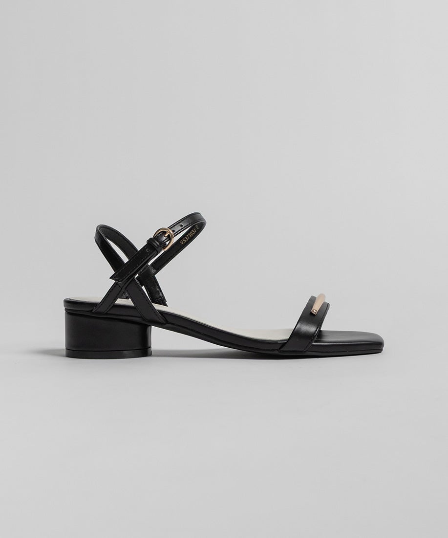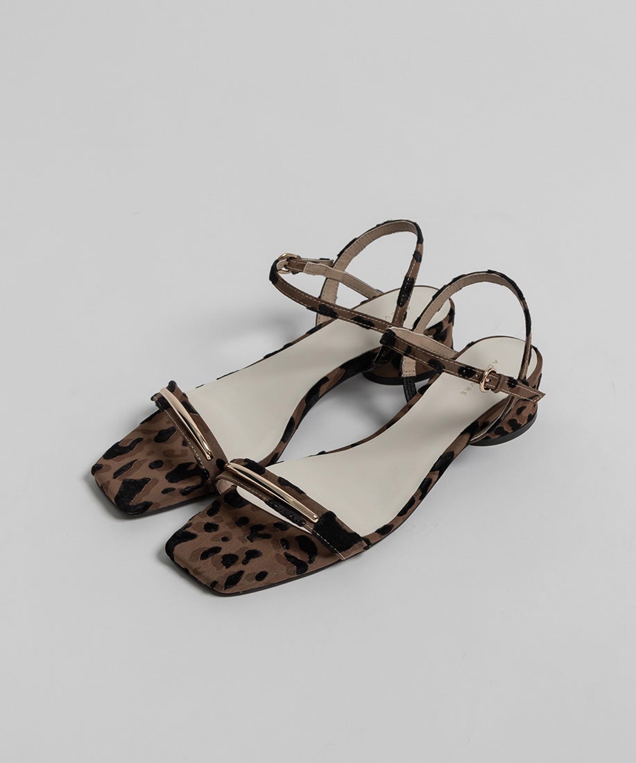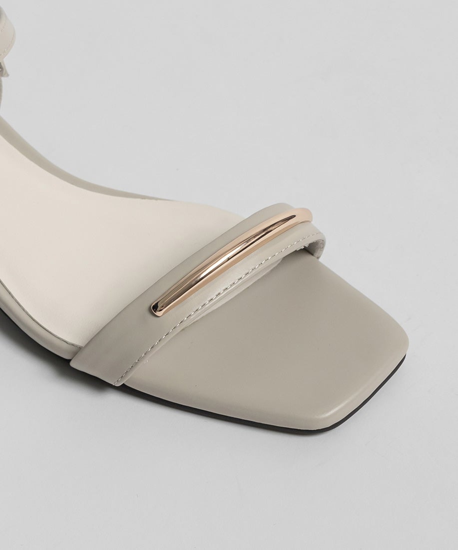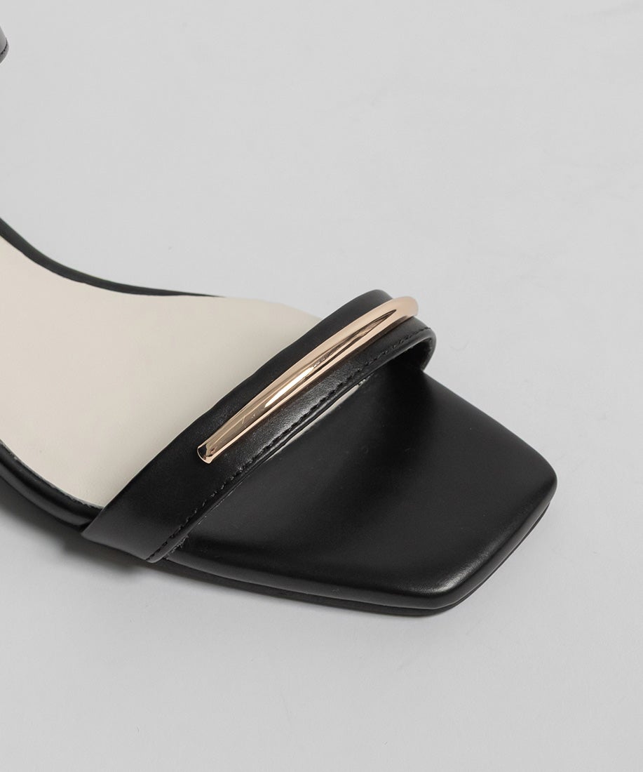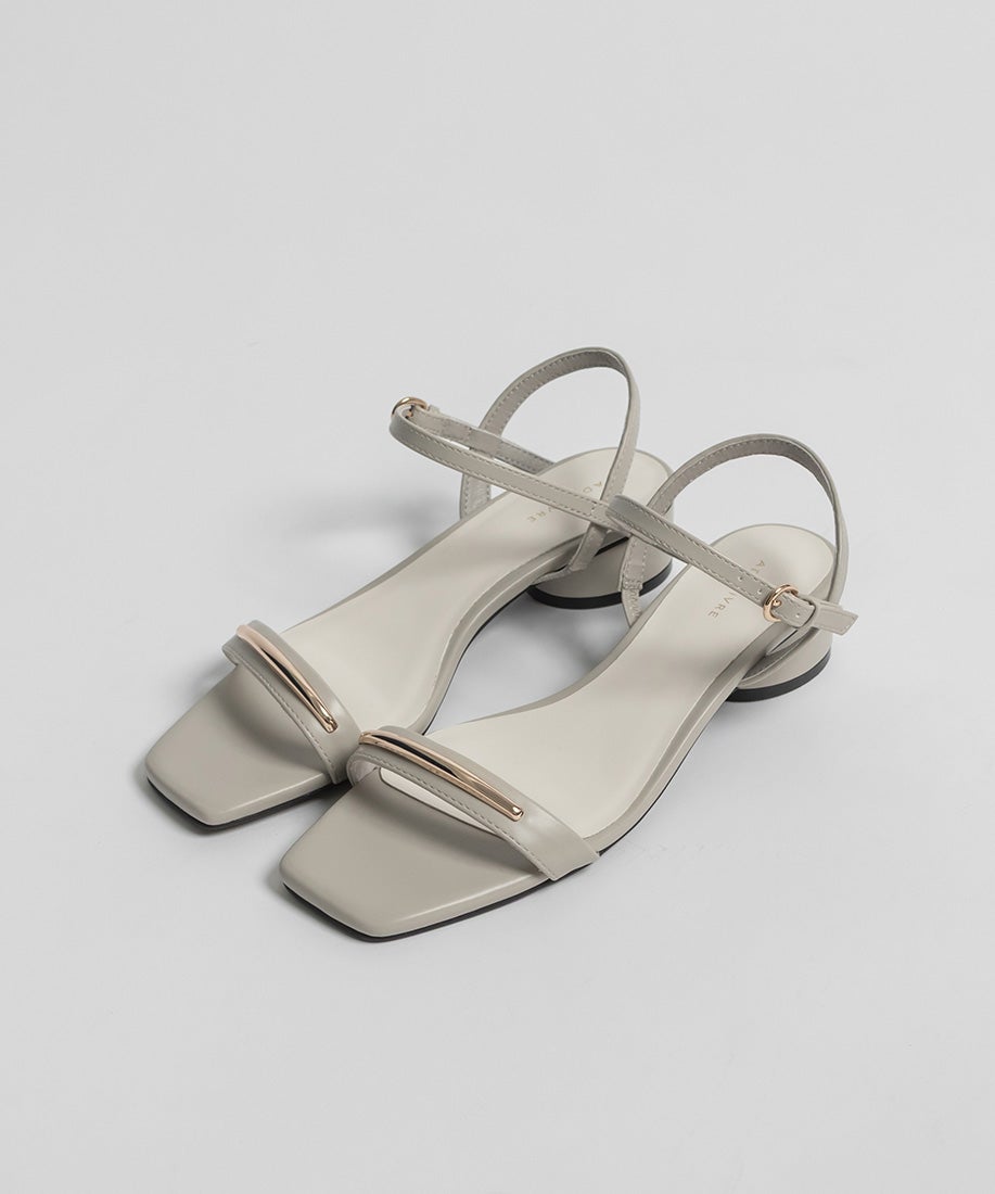 前ベルトにあしらったゴールドバーがさりげないアクセントになるスクエアトゥサンダル。