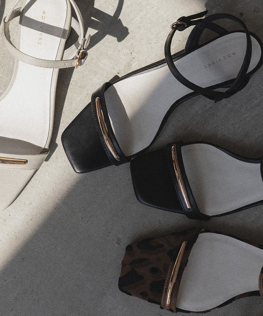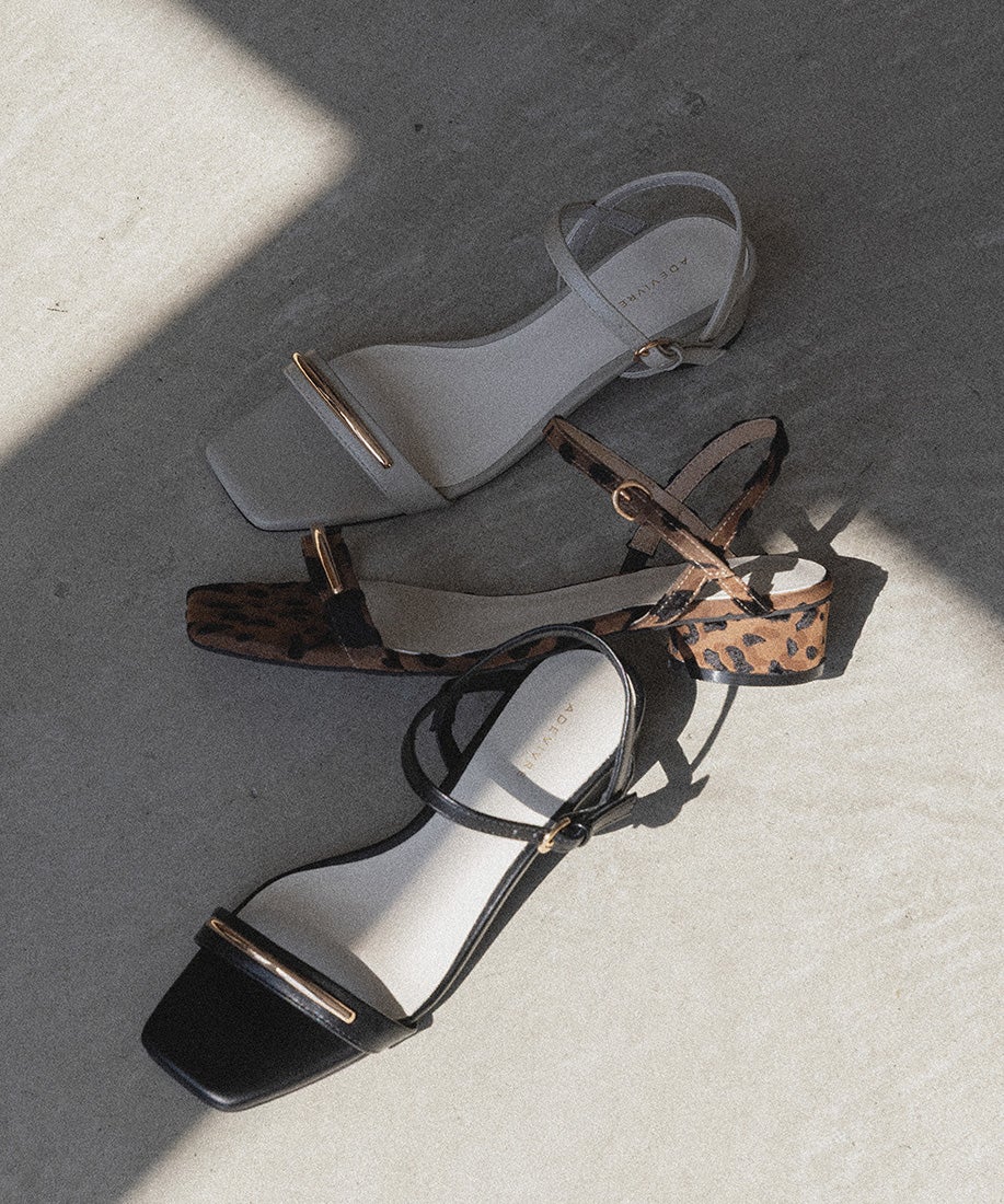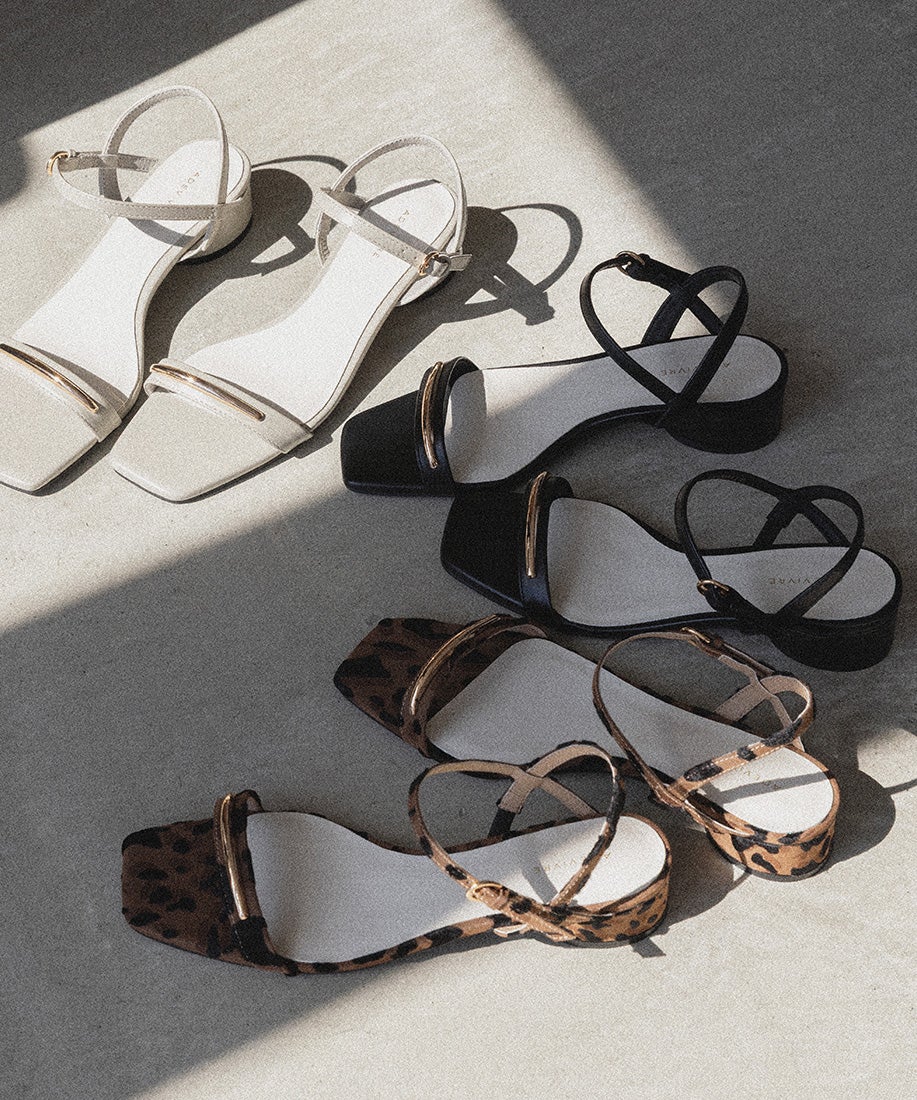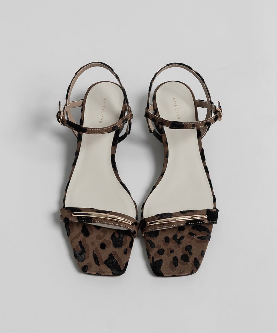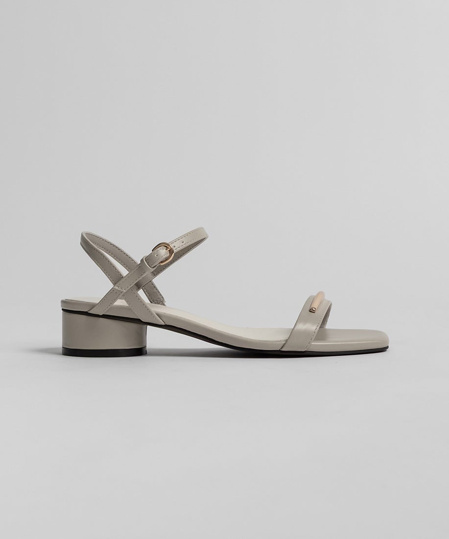 前ベルトにあしらったゴールドバーがさりげないアクセントになるスクエアトゥサンダル。