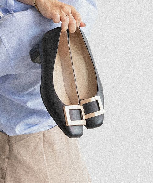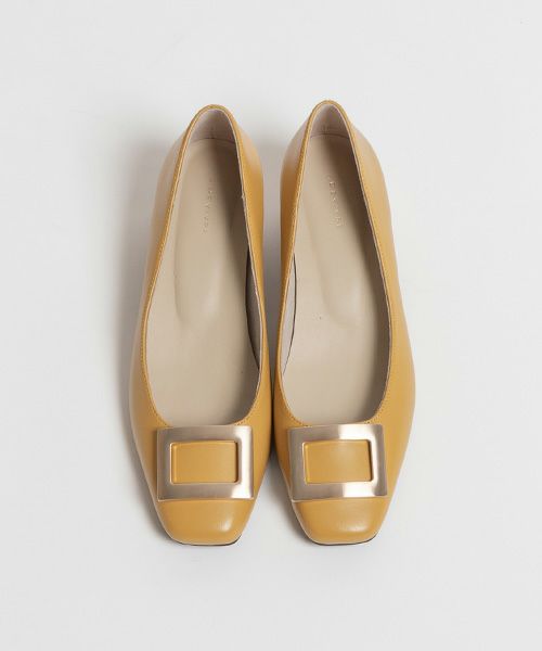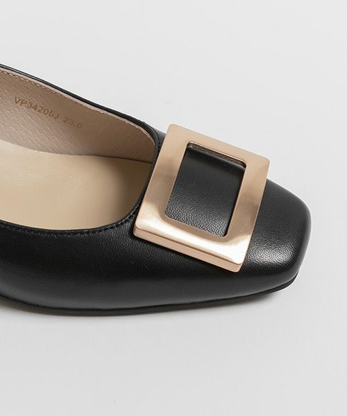 存在感のあるゴールドバックルが上品な雰囲気のレザーパンプスです。
