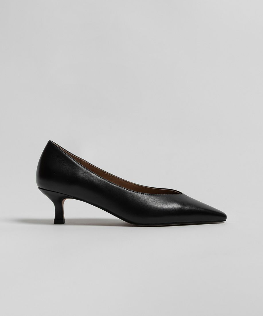 ロングノーズのスクエアトゥですっきりとしたシルエットのレザーパンプス。