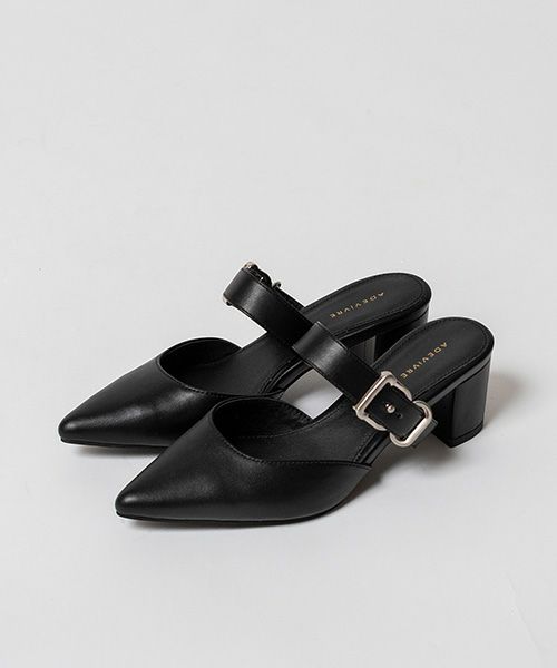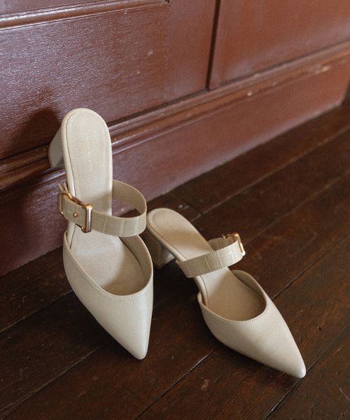 シャープなポインテッドトゥとワンベルトがポイントのミュールパンプス。