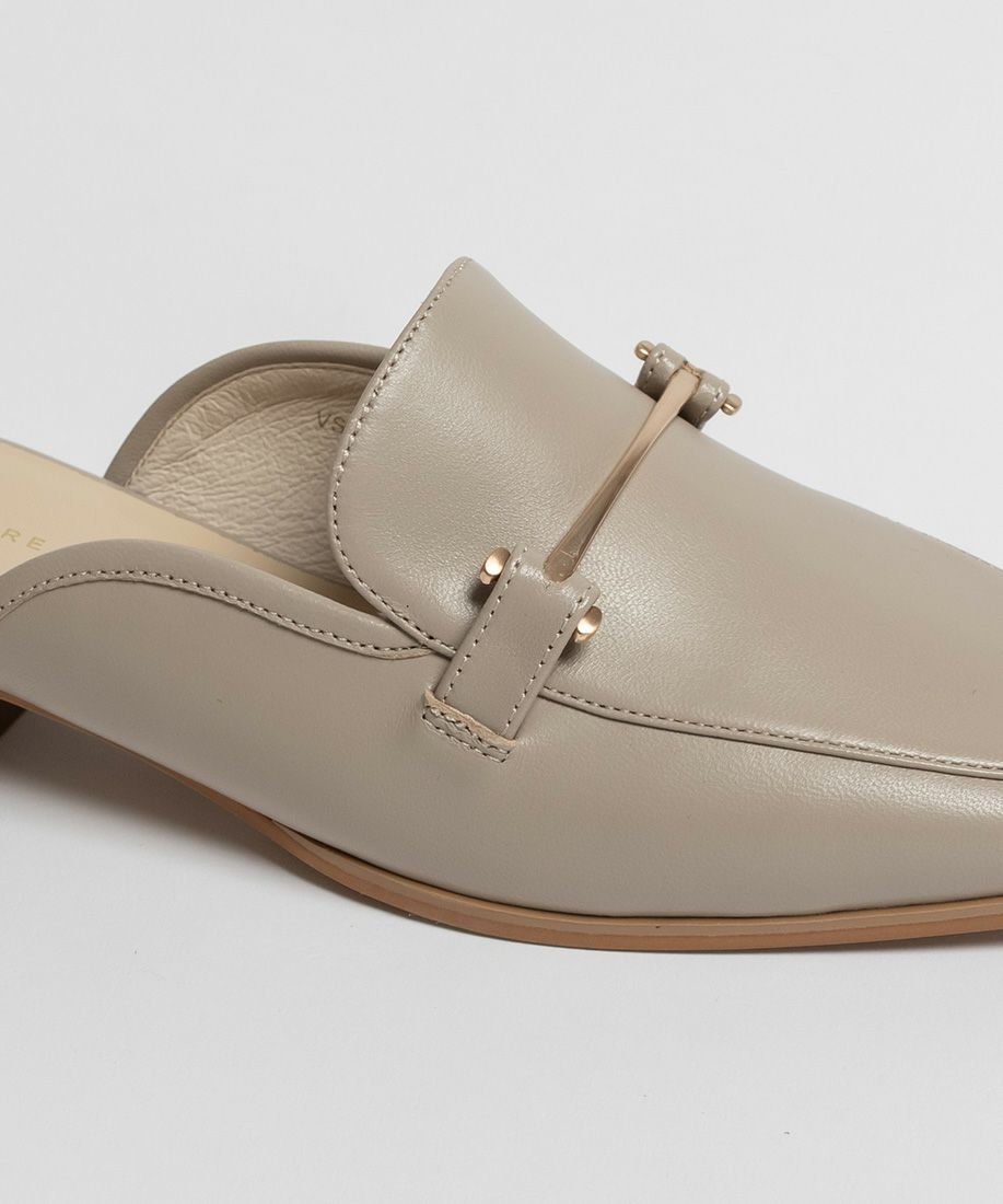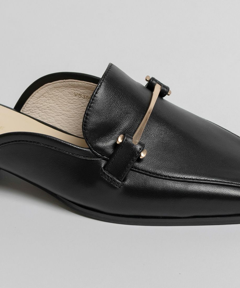 クラシックなローファーとミュールという対称的な要素を組み合わせたシューズ。